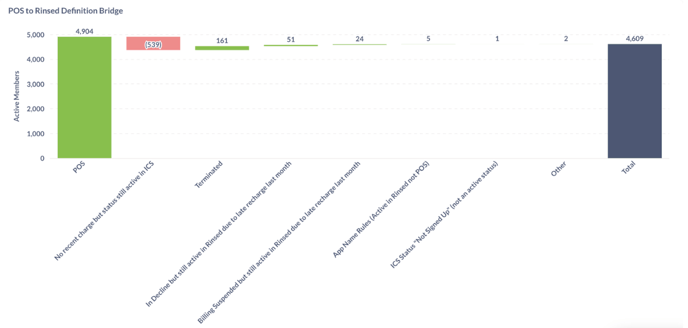 For example, in the image below, 539 members are active in the POS but not in Rinsed because there has been no recent charge, but their status in ICS is still active. 161 members are active in Rinsed but not the POS because they have been Terminated recently.