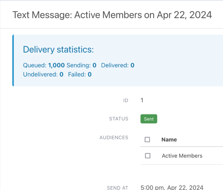 - Text delivery status update: Delivery statistics now show when messages are queued up due to rate limiting. Limits on how many messages you can send primarily exist to prevent spam and ensure quality of service. Messages that are queued will also show up in the count on the scheduled messages list page.